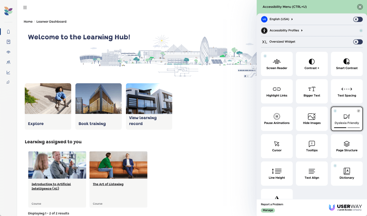 Cortexa utilises the UserWay technology to offer LMS customers the opportunity to enhance their accessibility compliance and make their eLearning available for people with disaability across the widest spectrum. All the functionality is discreetly provided via a widget which provides instant cusomisations based on the user selected settings.
