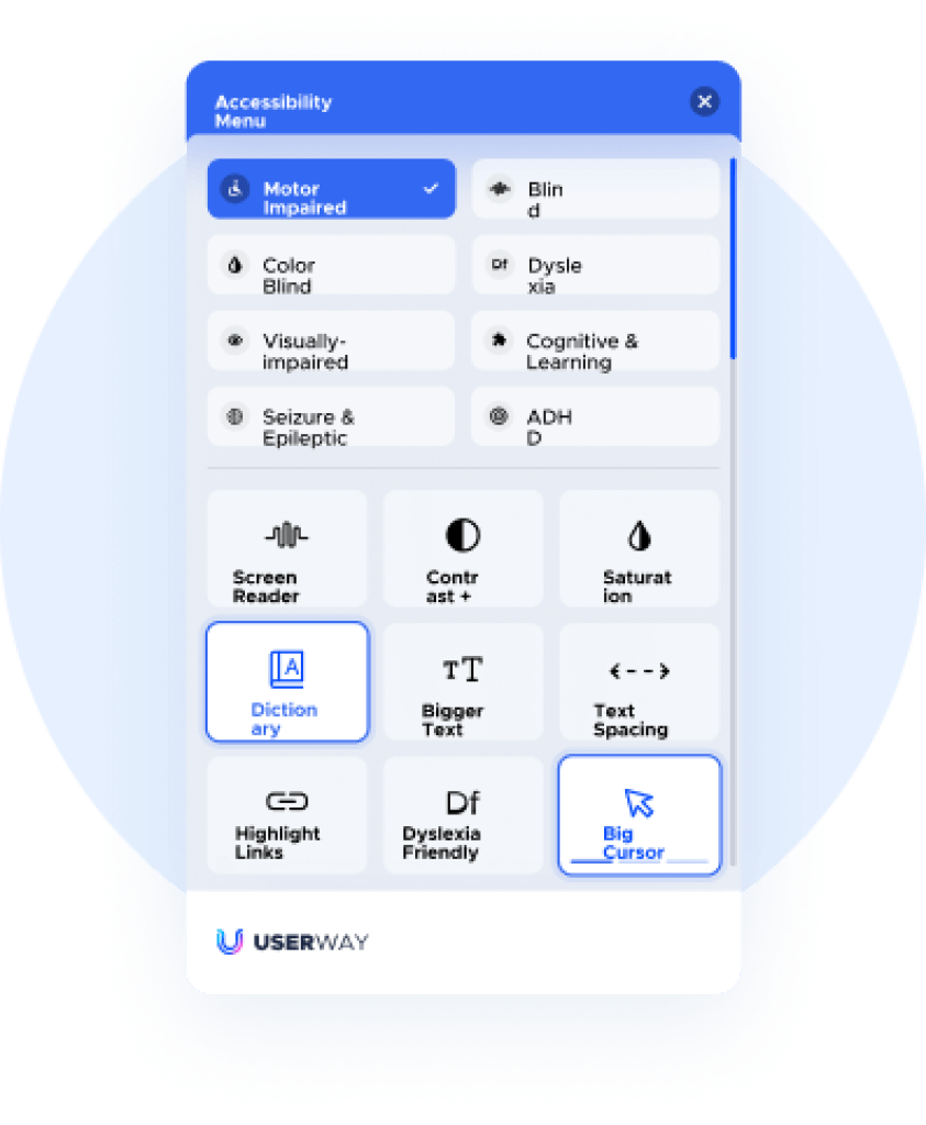 The Userway widget options panel lower barriers of entry to online learning and reduces the friction encountered by people with disabilities who would otherwise struggle or as worse be excluded.